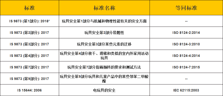 *:根據(jù)印度標(biāo)準(zhǔn)局信息,最新版本的IS 9873(第1部分)為2019版,與本法令中提到的標(biāo)準(zhǔn)版本不同,批準(zhǔn)法令中的標(biāo)準(zhǔn)版本可能會被更改。此外,等同的標(biāo)準(zhǔn)是ISO 8124-1:2018。